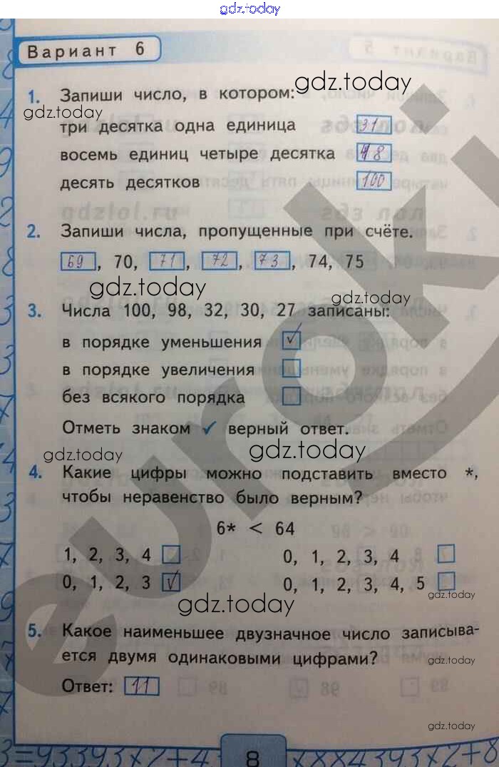 На страницах сайта gdz.today вы найдете учебный и вспомогательный материал, направленный на улучшения знаний школьной программы. ГДЗ - онлайн мир знаний Числа 20—100 Решение к части 1 Вар-6 Контрольным работам по Математике для 2 класса Рудницкая Экзамен УМК 2017