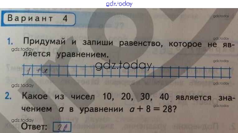 На страницах сайта gdz.today вы найдете учебный и вспомогательный материал, направленный на улучшения знаний школьной программы. ГДЗ - онлайн мир знаний Уравнение Решение к части 1 Вар-4 Контрольным работам по Математике для 2 класса Рудницкая Экзамен УМК 2017