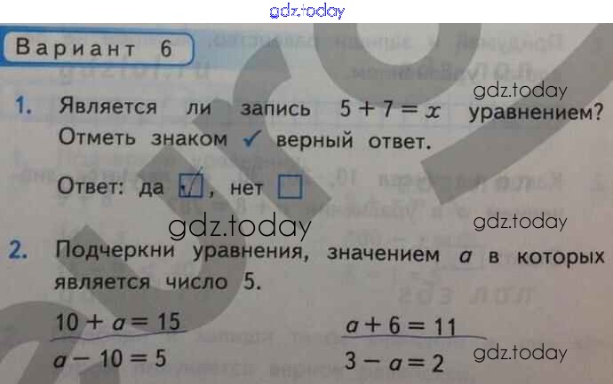 На страницах сайта gdz.today вы найдете учебный и вспомогательный материал, направленный на улучшения знаний школьной программы. ГДЗ - онлайн мир знаний Уравнение Решение к части 1 Вар-6 Контрольным работам по Математике для 2 класса Рудницкая Экзамен УМК 2017