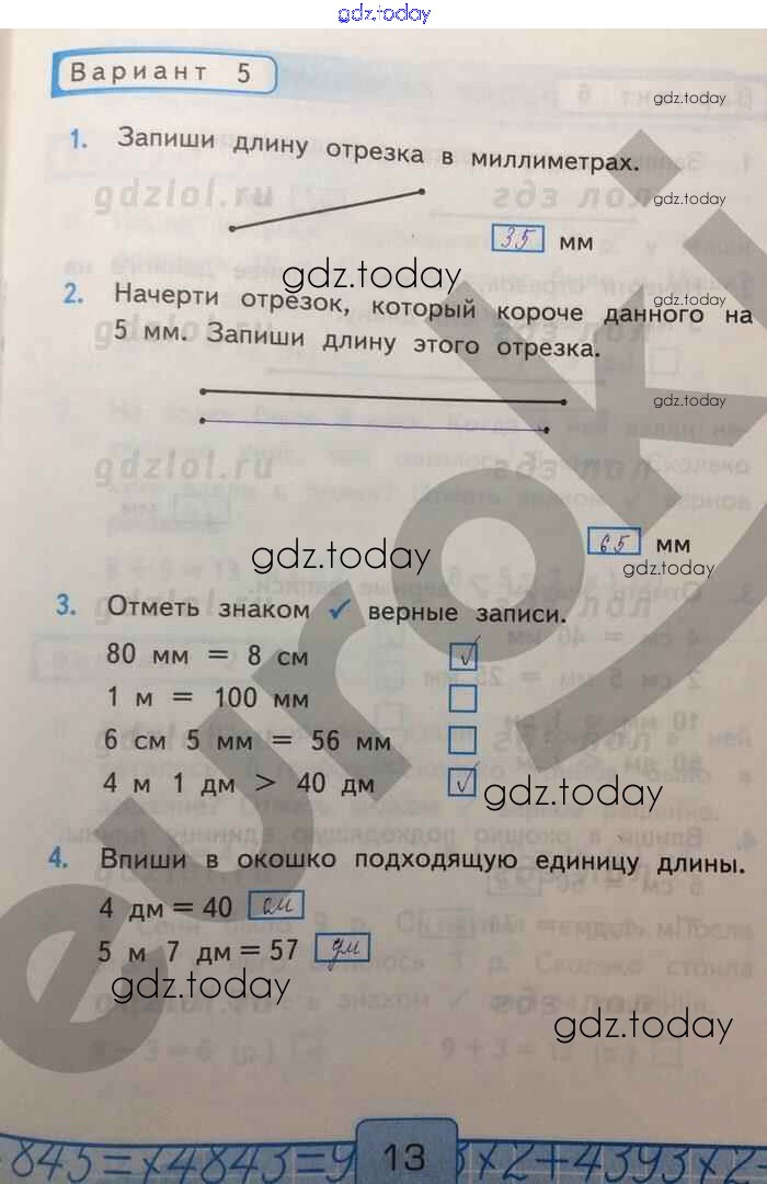 На страницах сайта gdz.today вы найдете учебный и вспомогательный материал, направленный на улучшения знаний школьной программы. ГДЗ - онлайн мир знаний Измерение длин Решение к части 1 Вар-5 Контрольным работам по Математике для 2 класса Рудницкая Экзамен УМК 2017