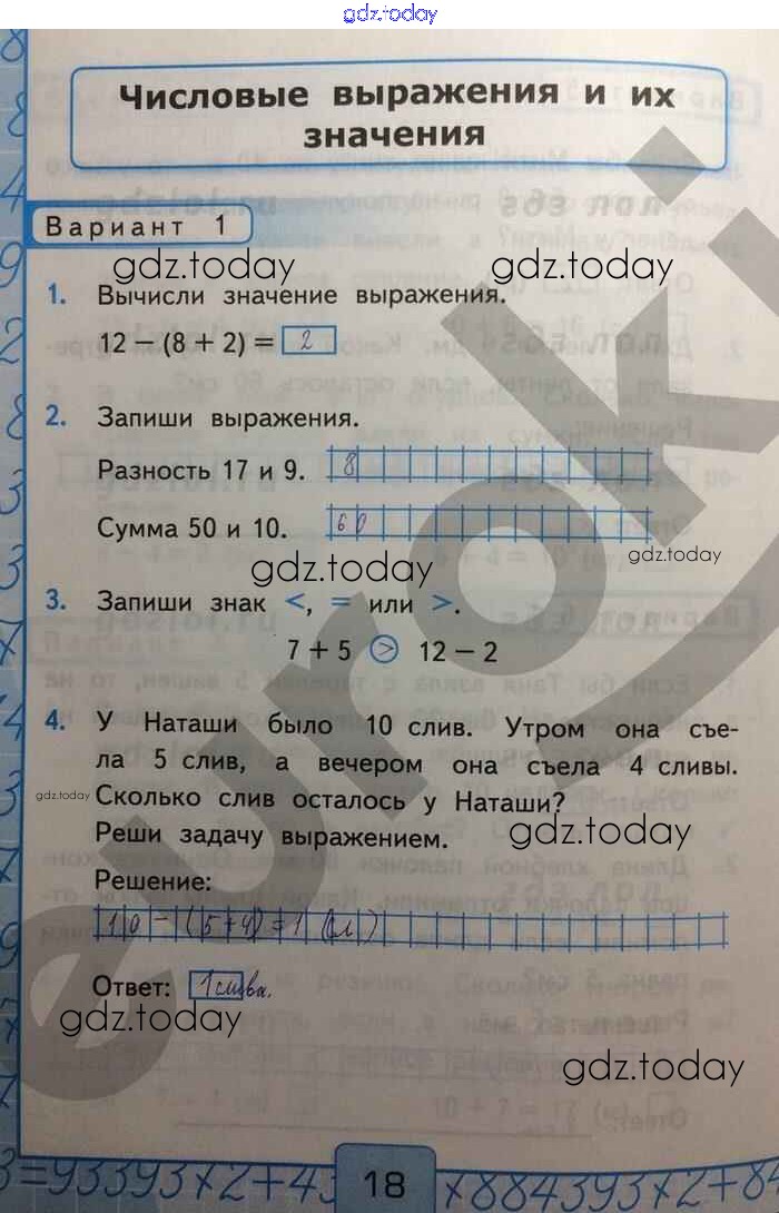 На страницах сайта gdz.today вы найдете учебный и вспомогательный материал, направленный на улучшения знаний школьной программы. ГДЗ - онлайн мир знаний Числовые выражения и их значения Решение к части 1 Вар-1 Контрольным работам по Математике для 2 класса Рудницкая Экзамен УМК 2017