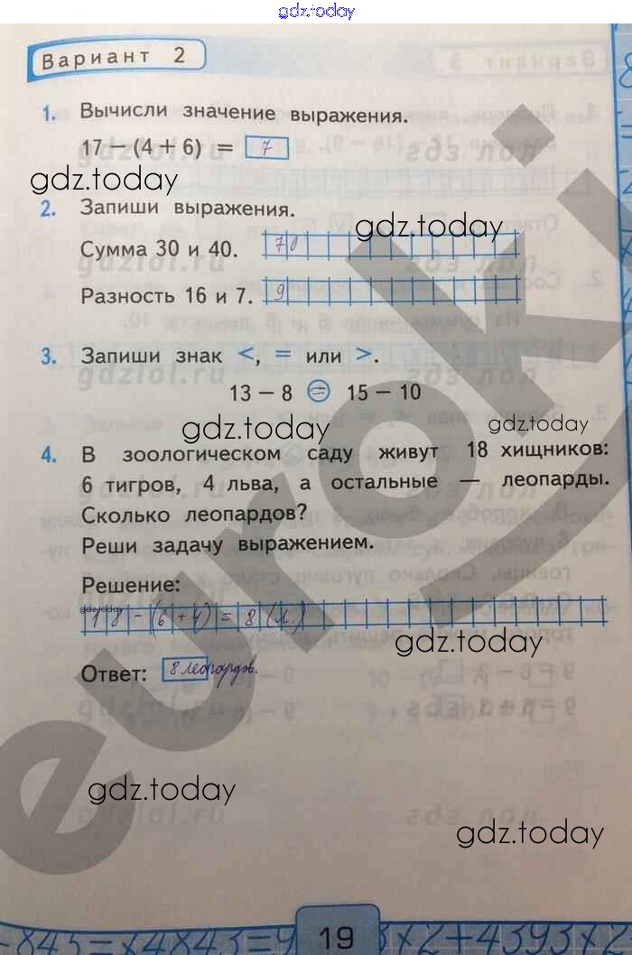 На страницах сайта gdz.today вы найдете учебный и вспомогательный материал, направленный на улучшения знаний школьной программы. ГДЗ - онлайн мир знаний Числовые выражения и их значения Решение к части 1 Вар-2 Контрольным работам по Математике для 2 класса Рудницкая Экзамен УМК 2017