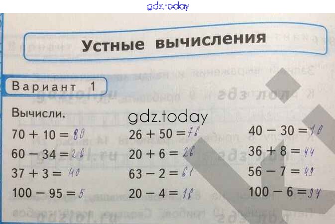 На страницах сайта gdz.today вы найдете учебный и вспомогательный материал, направленный на улучшения знаний школьной программы. ГДЗ - онлайн мир знаний Устные вычисления Решение к части 1 Вар-1 Контрольным работам по Математике для 2 класса Рудницкая Экзамен УМК 2017