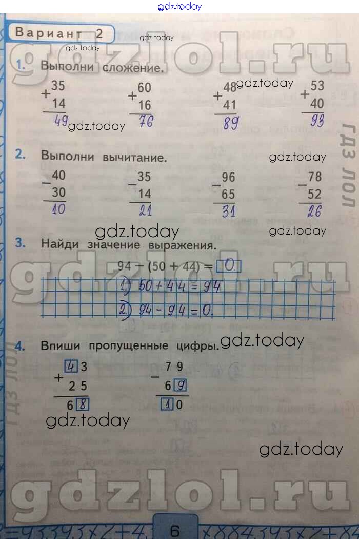 На страницах сайта gdz.today вы найдете учебный и вспомогательный материал, направленный на улучшения знаний школьной программы. ГДЗ - онлайн мир знаний Сложение и вычитание без перехода через десяток Решение к части 2 Вар-2 Контрольным работам по Математике для 2 класса Рудницкая Экзамен УМК 2017