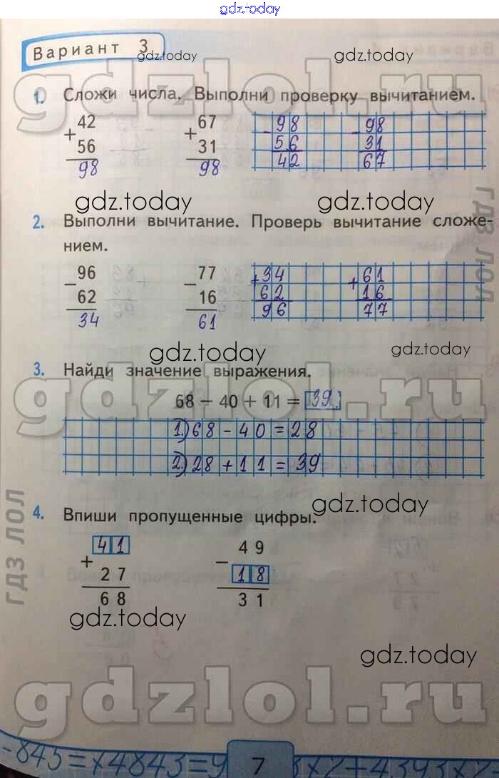 На страницах сайта gdz.today вы найдете учебный и вспомогательный материал, направленный на улучшения знаний школьной программы. ГДЗ - онлайн мир знаний Сложение и вычитание без перехода через десяток Решение к части 2 Вар-3 Контрольным работам по Математике для 2 класса Рудницкая Экзамен УМК 2017