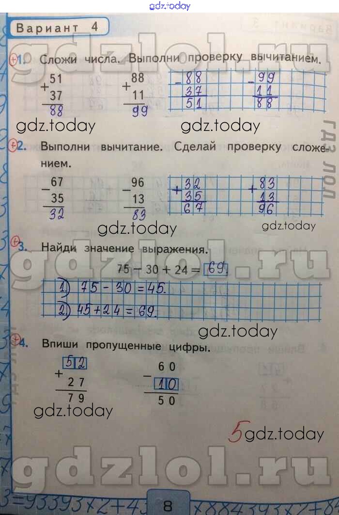 На страницах сайта gdz.today вы найдете учебный и вспомогательный материал, направленный на улучшения знаний школьной программы. ГДЗ - онлайн мир знаний Сложение и вычитание без перехода через десяток Решение к части 2 Вар-4 Контрольным работам по Математике для 2 класса Рудницкая Экзамен УМК 2017