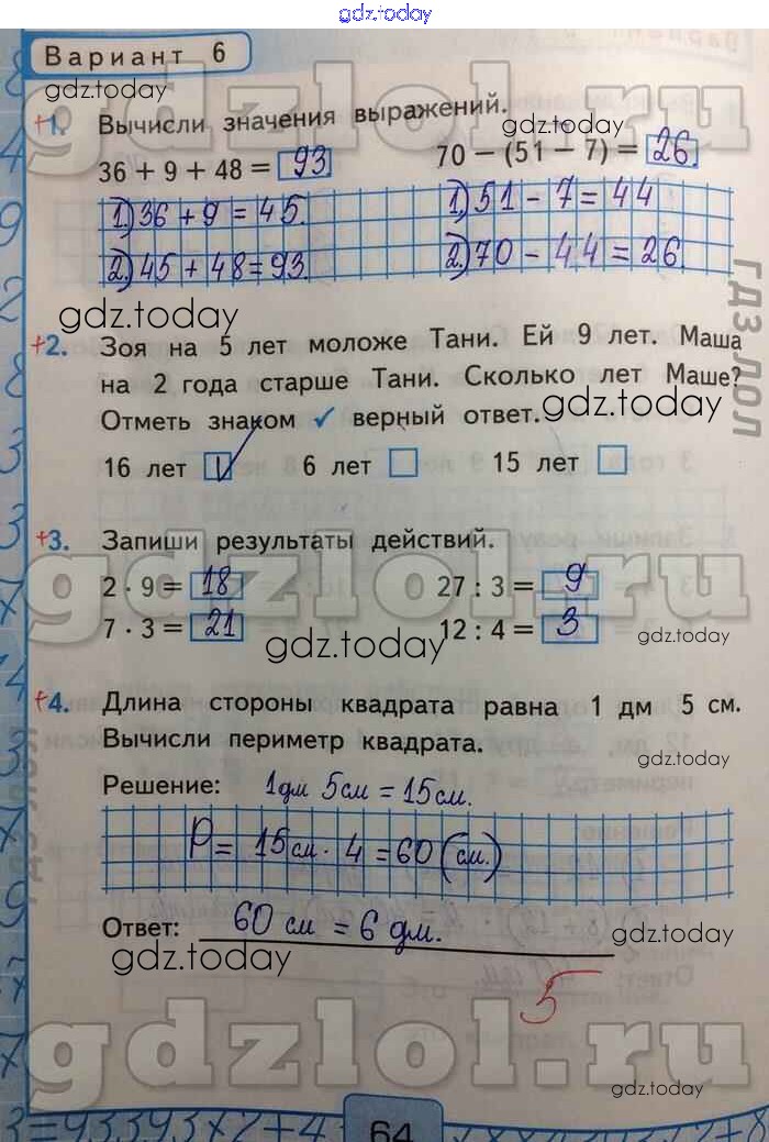 На страницах сайта gdz.today вы найдете учебный и вспомогательный материал, направленный на улучшения знаний школьной программы. ГДЗ - онлайн мир знаний Итоговая контрольная работа Решение к части 2 Вар-6 Контрольным работам по Математике для 2 класса Рудницкая Экзамен УМК 2017
