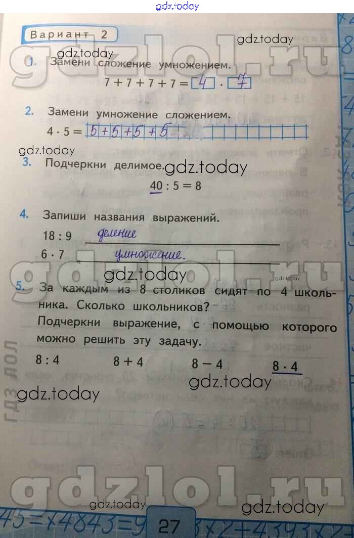 На страницах сайта gdz.today вы найдете учебный и вспомогательный материал, направленный на улучшения знаний школьной программы. ГДЗ - онлайн мир знаний Умножение и деление Решение к части 2 Вар-2 Контрольным работам по Математике для 2 класса Рудницкая Экзамен УМК 2017