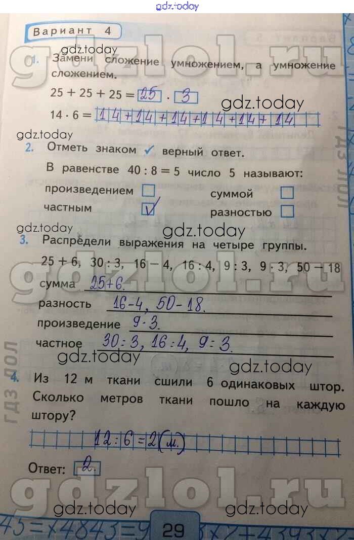 На страницах сайта gdz.today вы найдете учебный и вспомогательный материал, направленный на улучшения знаний школьной программы. ГДЗ - онлайн мир знаний Умножение и деление Решение к части 2 Вар-4 Контрольным работам по Математике для 2 класса Рудницкая Экзамен УМК 2017