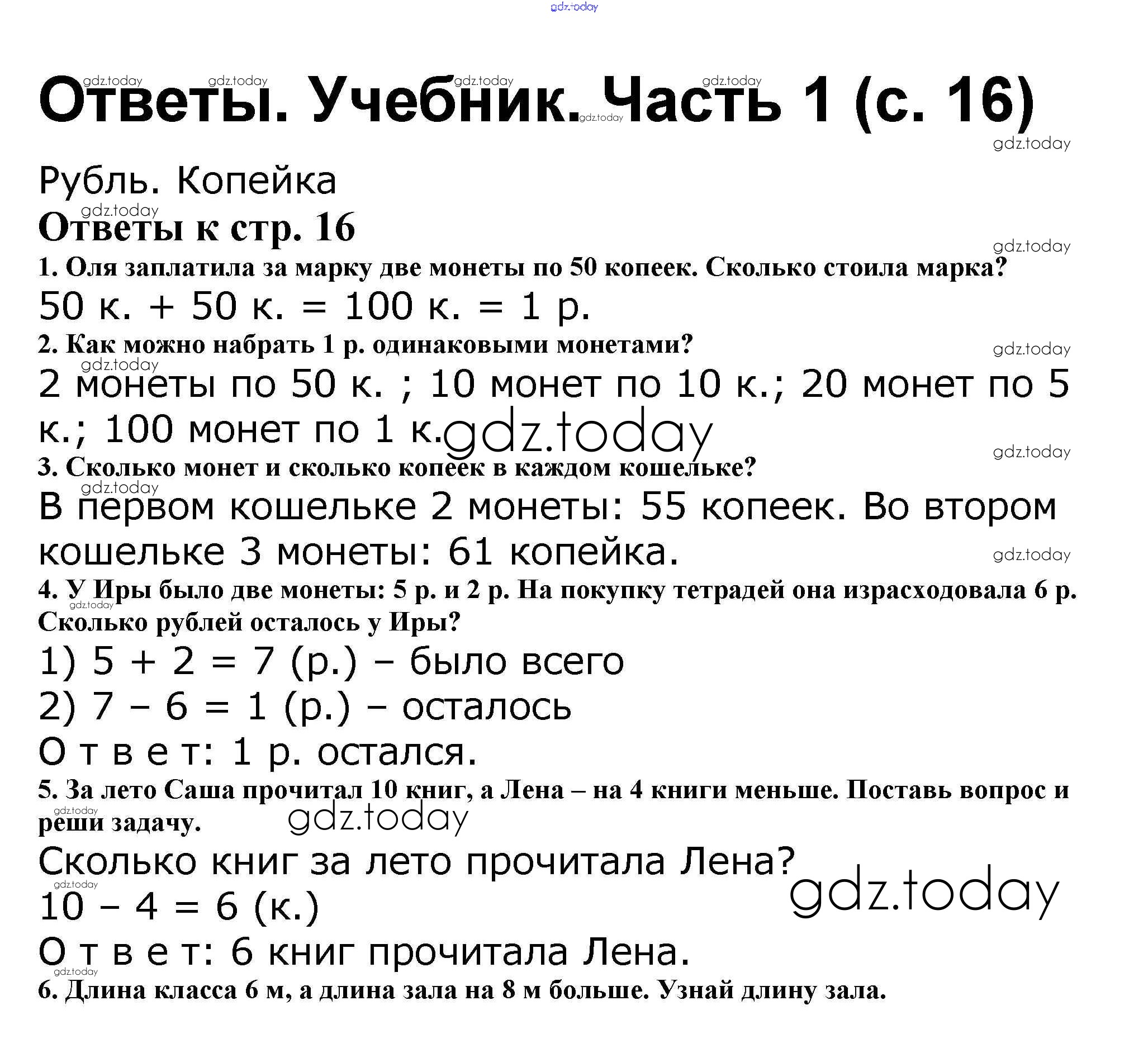 На страницах сайта gdz.today вы найдете учебный и вспомогательный материал, направленный на улучшения знаний школьной программы. ГДЗ - онлайн мир знаний Решение к части 1. Страницы 16 Учебнику по Математике для 2 класса Моро, Бантова Просвещение Школа России 2015