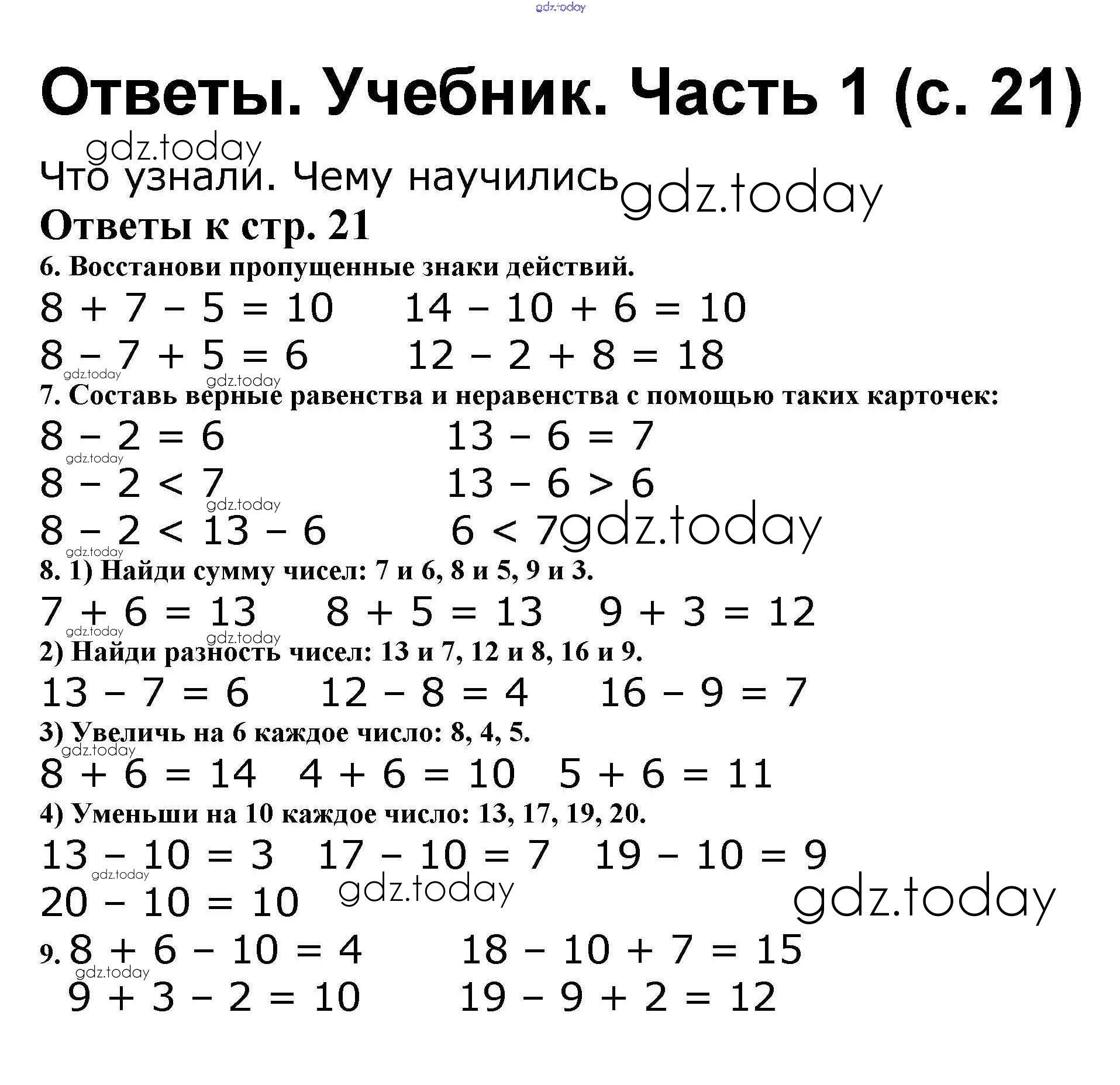 На страницах сайта gdz.today вы найдете учебный и вспомогательный материал, направленный на улучшения знаний школьной программы. ГДЗ - онлайн мир знаний Решение к части 1. Страницы 21 Учебнику по Математике для 2 класса Моро, Бантова Просвещение Школа России 2015