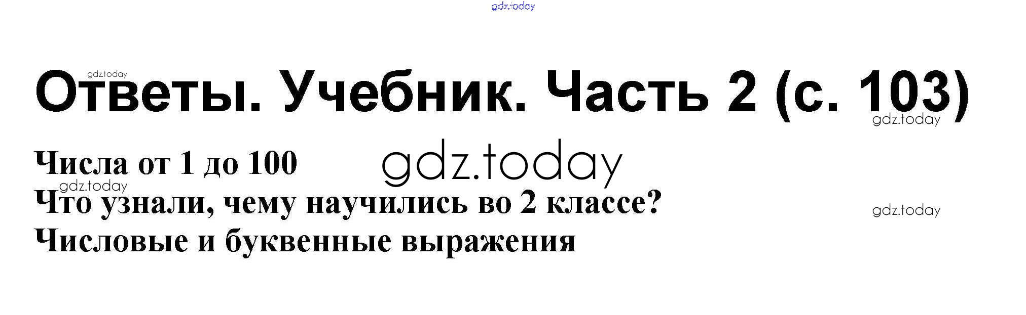 На страницах сайта gdz.today вы найдете учебный и вспомогательный материал, направленный на улучшения знаний школьной программы. ГДЗ - онлайн мир знаний Решение к части 2. Страницы 103 Учебнику по Математике для 2 класса Моро, Бантова Просвещение Школа России 2015