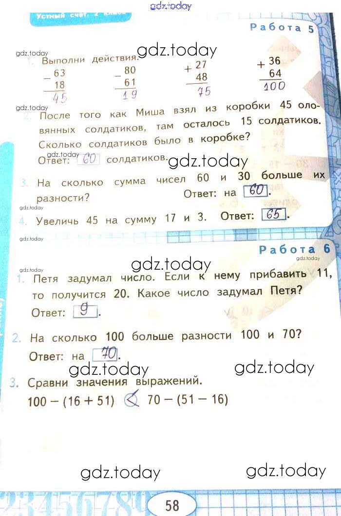 На страницах сайта gdz.today вы найдете учебный и вспомогательный материал, направленный на улучшения знаний школьной программы. ГДЗ - онлайн мир знаний Страницы (решение) 58 Рабочей тетради по Математике для 2 класса Рудницкая Экзамен УМК 2020