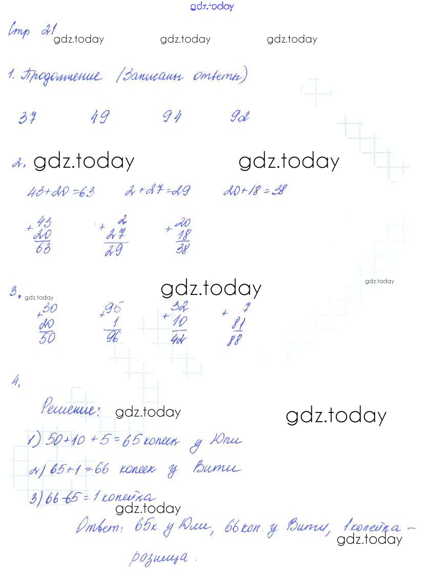 На страницах сайта gdz.today вы найдете учебный и вспомогательный материал, направленный на улучшения знаний школьной программы. ГДЗ - онлайн мир знаний Решение к части 1. Страницы 21 Рабочей тетради по Математике для 2 класса Рудницкая, Юдачева Вентана-граф Начальная школа XXI века 2014