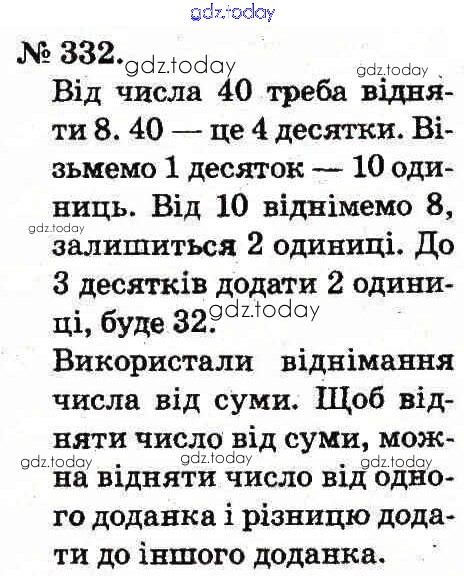 На страницах сайта gdz.today вы найдете учебный и вспомогательный материал, направленный на улучшения знаний школьной программы. ГДЗ - онлайн мир знаний Рішення до Усне додавання і віднімання двоцифрових чисел з переходом через розряд 332 Учебнику по Математике для 2 класса Богданович, Лишенко Генеза 2012