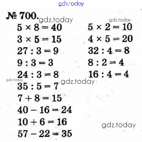 На страницах сайта gdz.today вы найдете учебный и вспомогательный материал, направленный на улучшения знаний школьной программы. ГДЗ - онлайн мир знаний Рішення до Арифметичні дії множення та ділення 700 Учебнику по Математике для 2 класса Богданович, Лишенко Генеза 2012