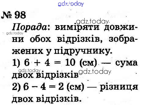 На страницах сайта gdz.today вы найдете учебный и вспомогательный материал, направленный на улучшения знаний школьной программы. ГДЗ - онлайн мир знаний Рішення до Розділ 1 98 Учебнику по Математике для 2 класса Оляницкая, Ривкинд Освiта 2012