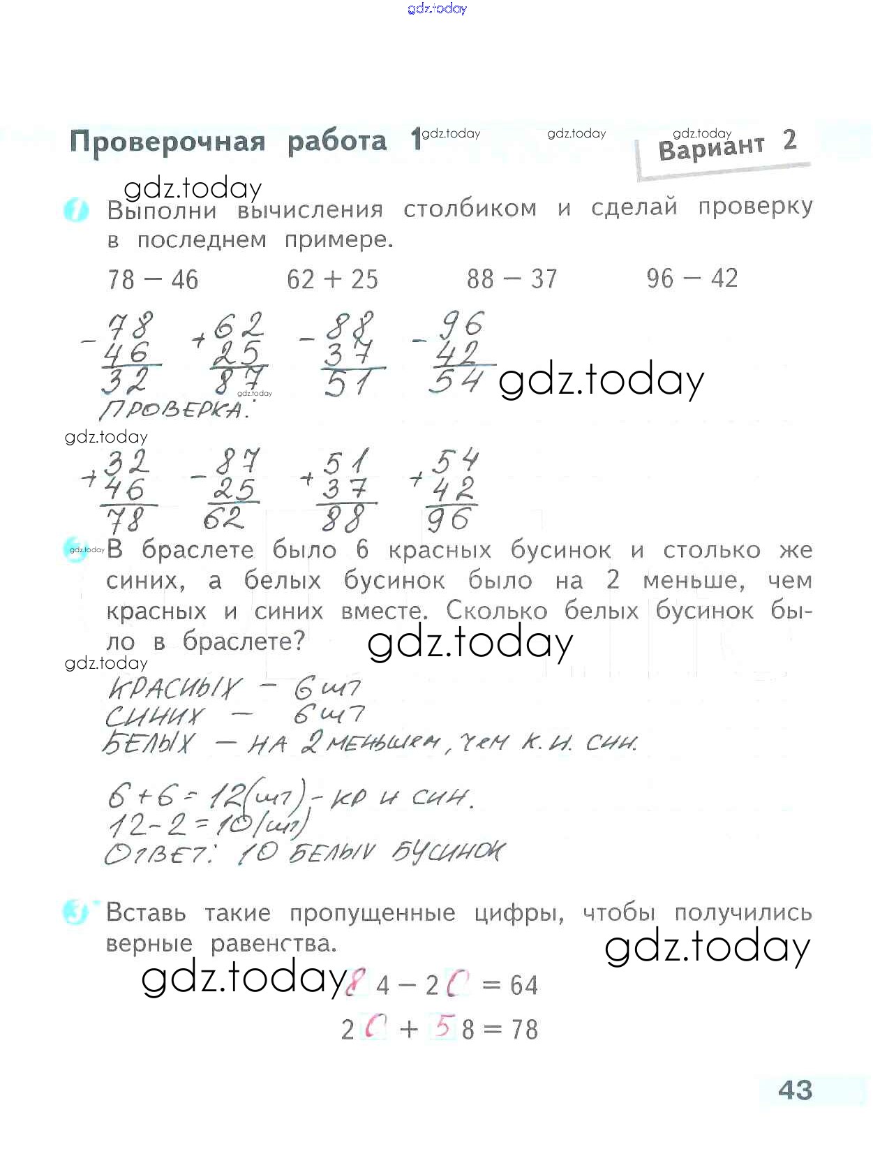 На страницах сайта gdz.today вы найдете учебный и вспомогательный материал, направленный на улучшения знаний школьной программы. ГДЗ - онлайн мир знаний Страницы (решение) 43 Проверочным работам по Математике для 2 класса Волкова Просвещение Школа России 2014