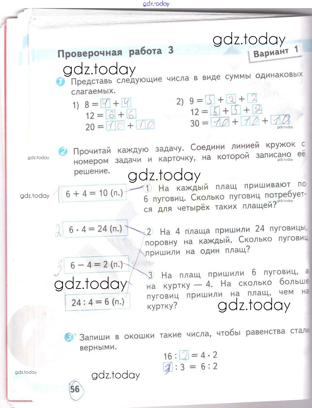 На страницах сайта gdz.today вы найдете учебный и вспомогательный материал, направленный на улучшения знаний школьной программы. ГДЗ - онлайн мир знаний Страницы (решение) 56 Проверочным работам по Математике для 2 класса Волкова Просвещение Школа России 2014