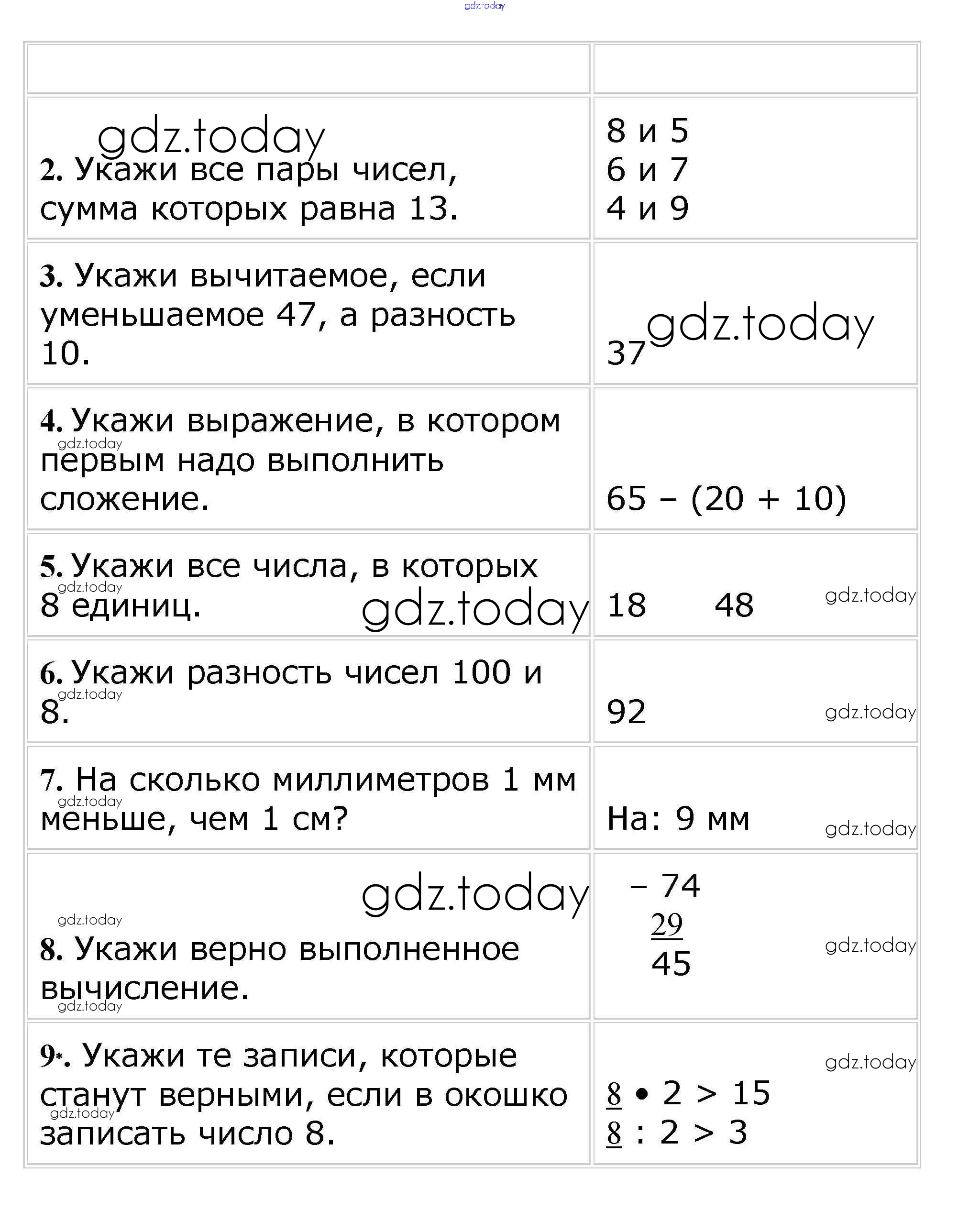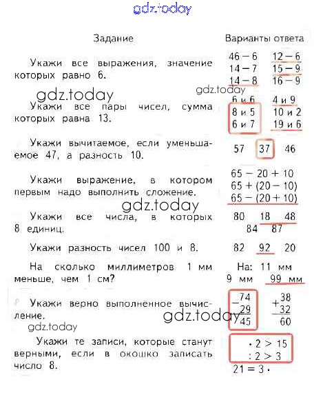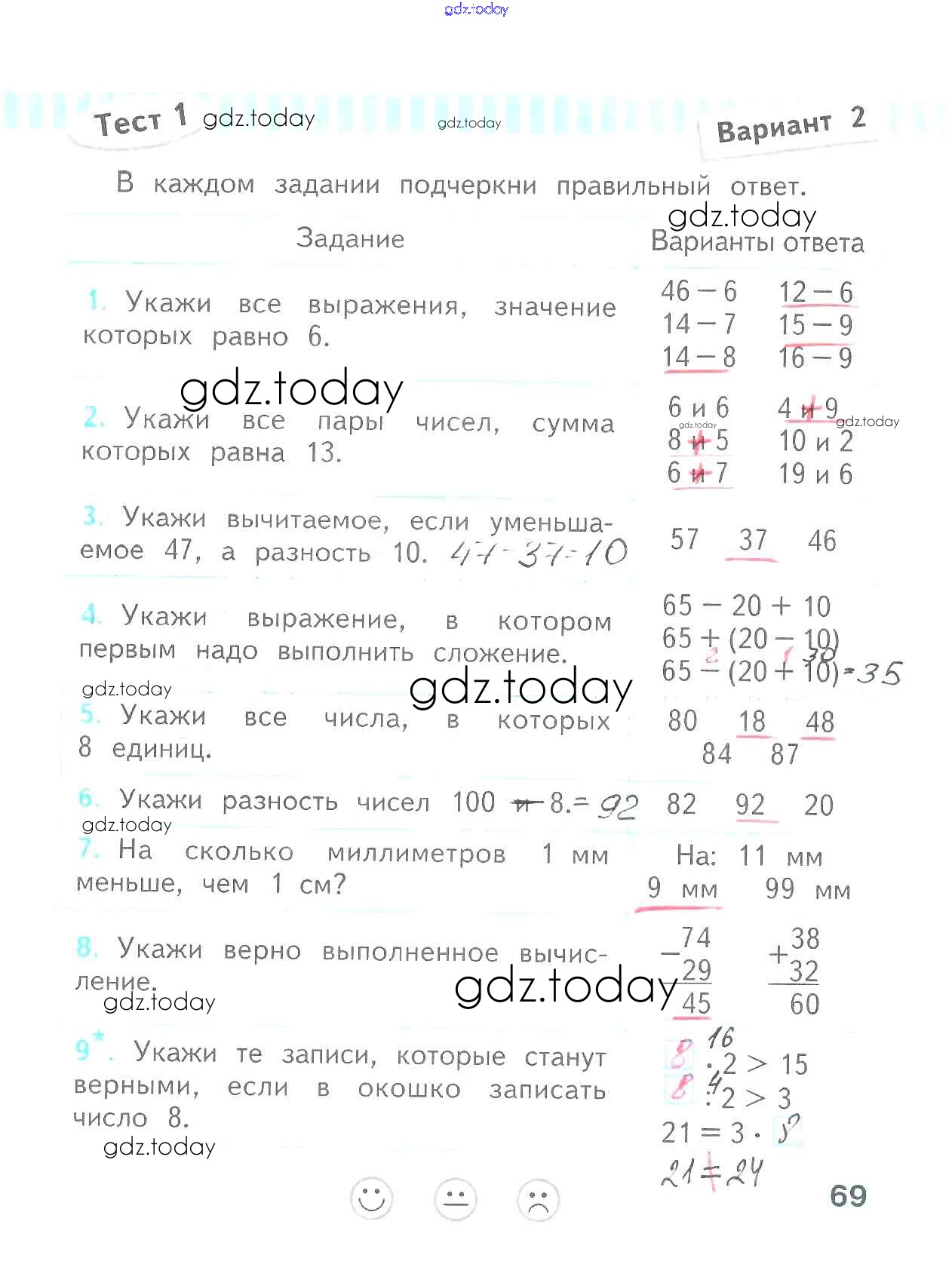 На страницах сайта gdz.today вы найдете учебный и вспомогательный материал, направленный на улучшения знаний школьной программы. ГДЗ - онлайн мир знаний Страницы (решение) 69 Проверочным работам по Математике для 2 класса Волкова Просвещение Школа России 2014