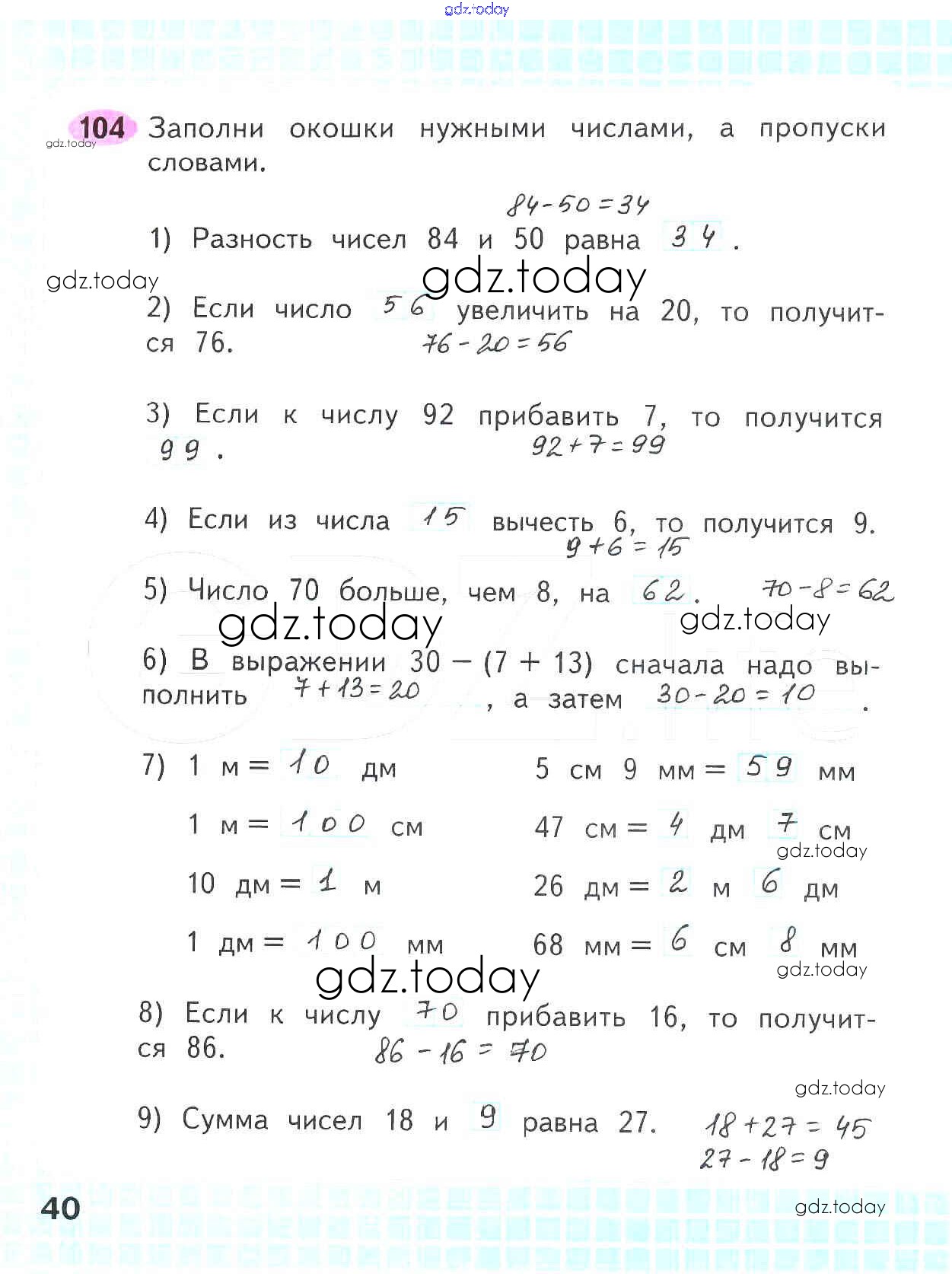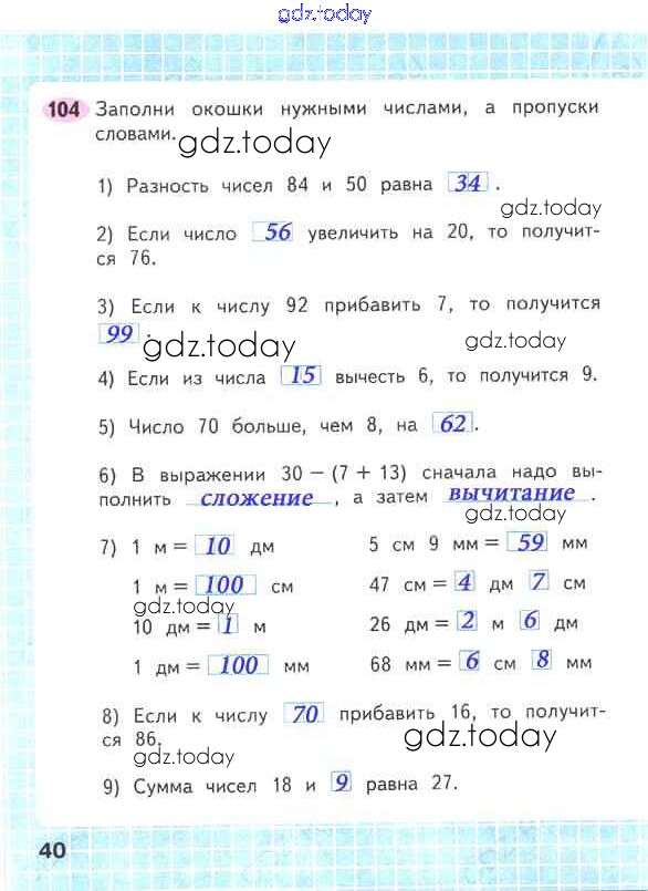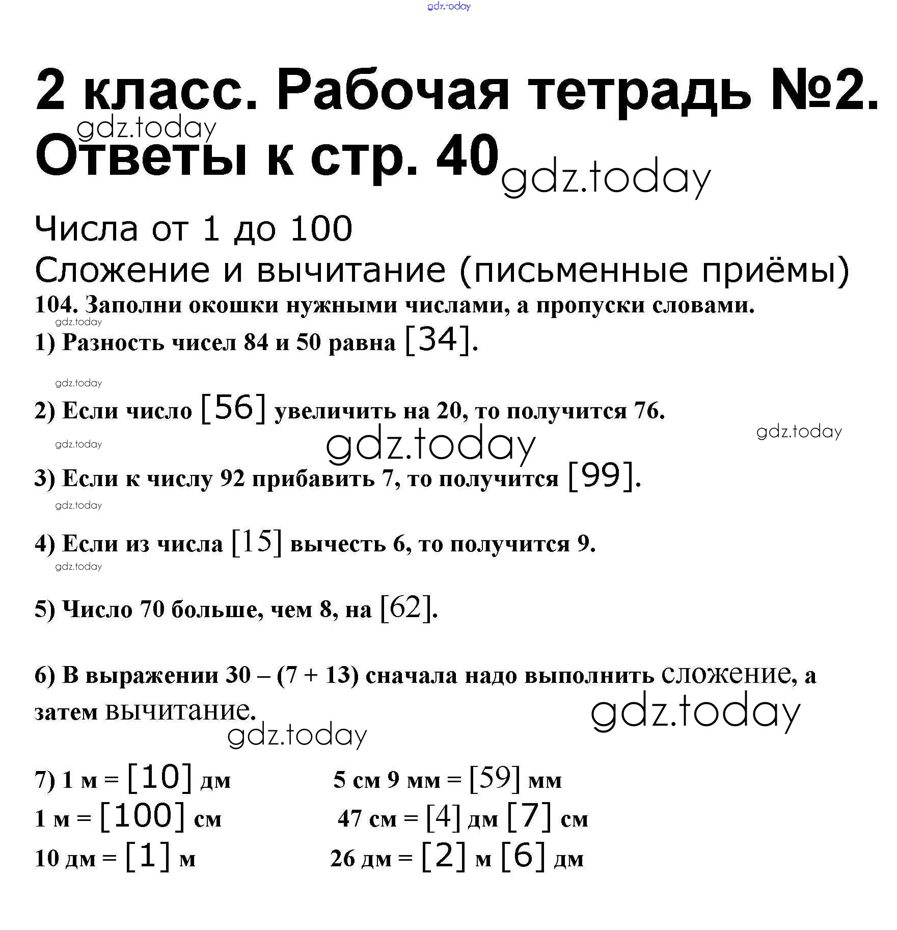 На страницах сайта gdz.today вы найдете учебный и вспомогательный материал, направленный на улучшения знаний школьной программы. ГДЗ - онлайн мир знаний Решение к части 2. Страницы 40 Рабочей тетради по Математике для 2 класса Волкова, Моро Просвещение Школа России 2016