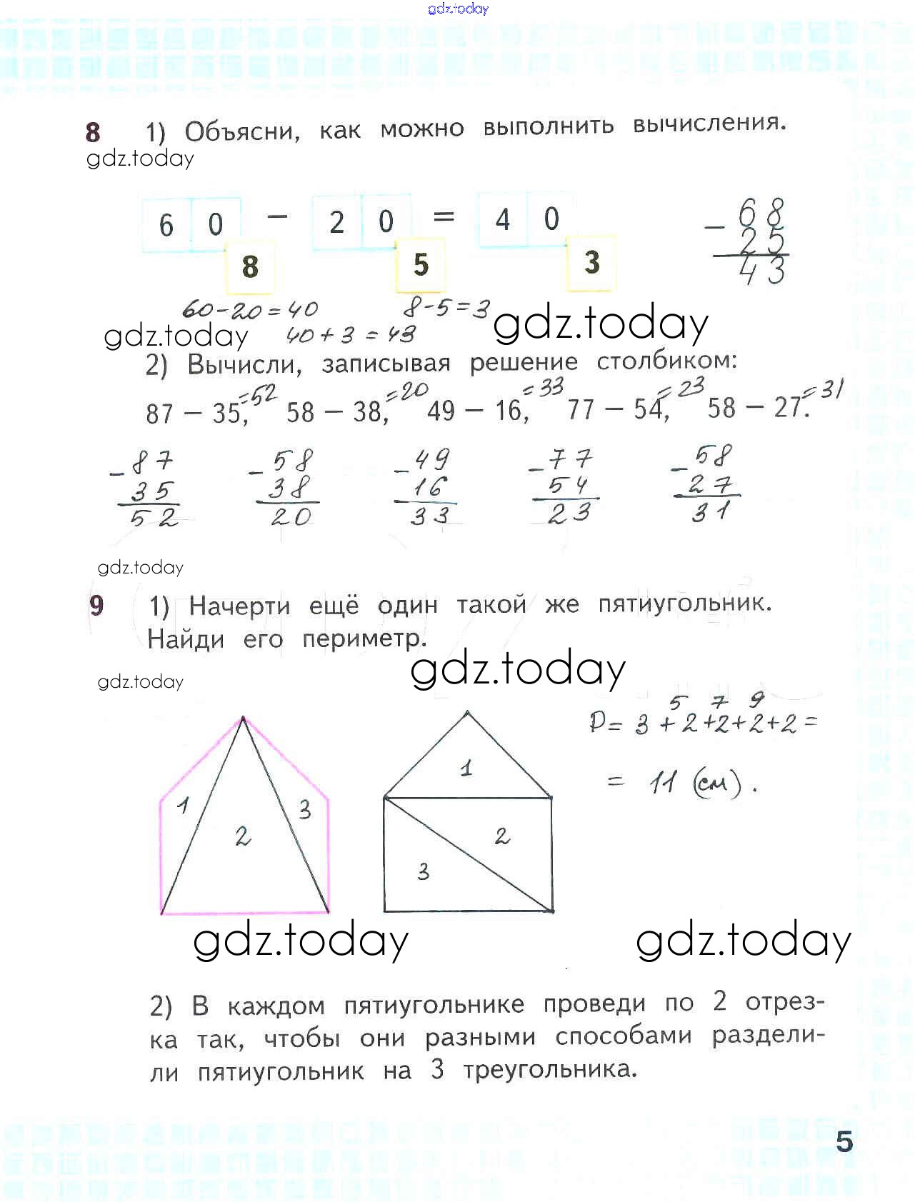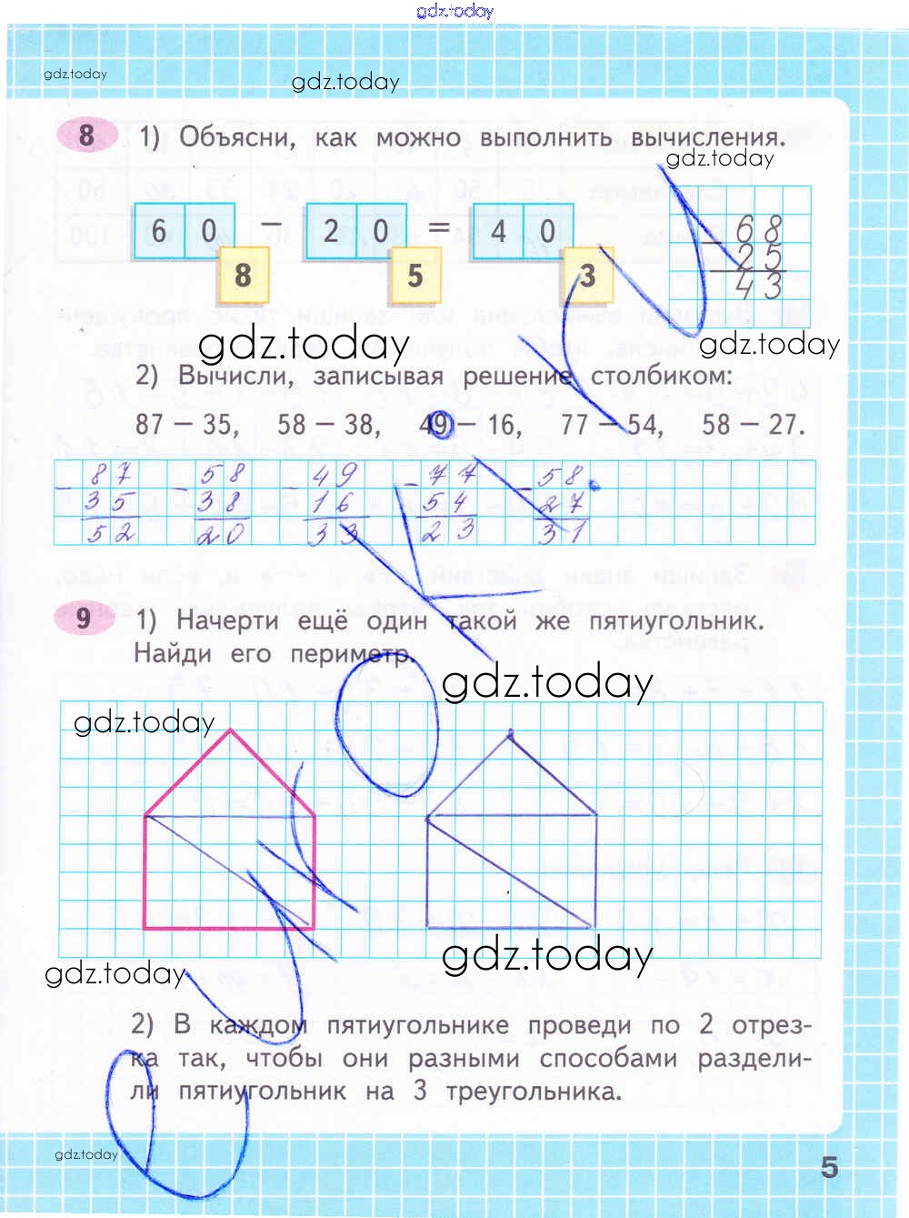На страницах сайта gdz.today вы найдете учебный и вспомогательный материал, направленный на улучшения знаний школьной программы. ГДЗ - онлайн мир знаний Решение к части 2. Страницы 5 Рабочей тетради по Математике для 2 класса Волкова, Моро Просвещение Школа России 2016