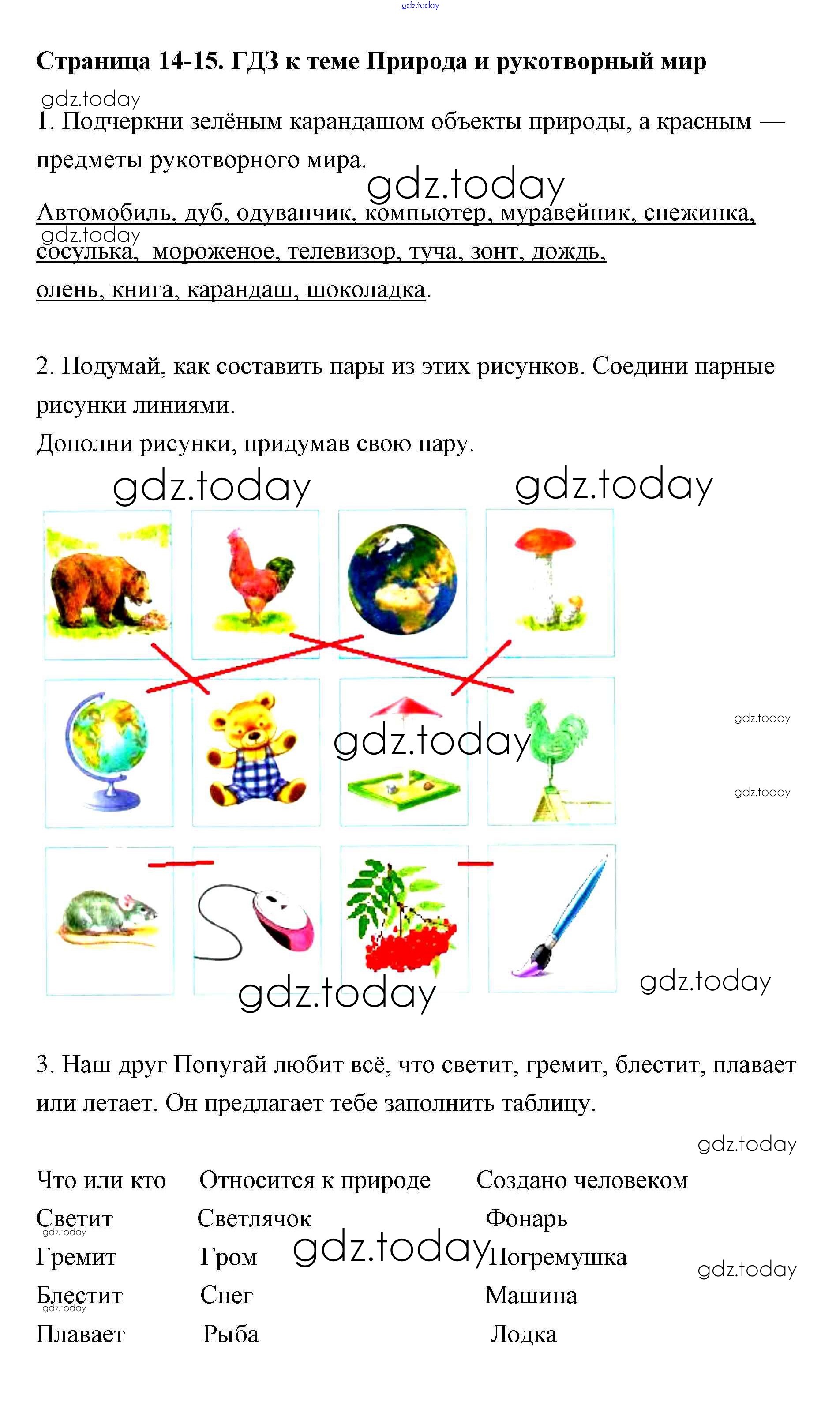 На страницах сайта gdz.today вы найдете учебный и вспомогательный материал, направленный на улучшения знаний школьной программы. ГДЗ - онлайн мир знаний Решение к части 1 (Страницы) 14-15 Рабочей тетради по Окружающему миру для 2 класса Плешаков Просвещение Школа России 2016