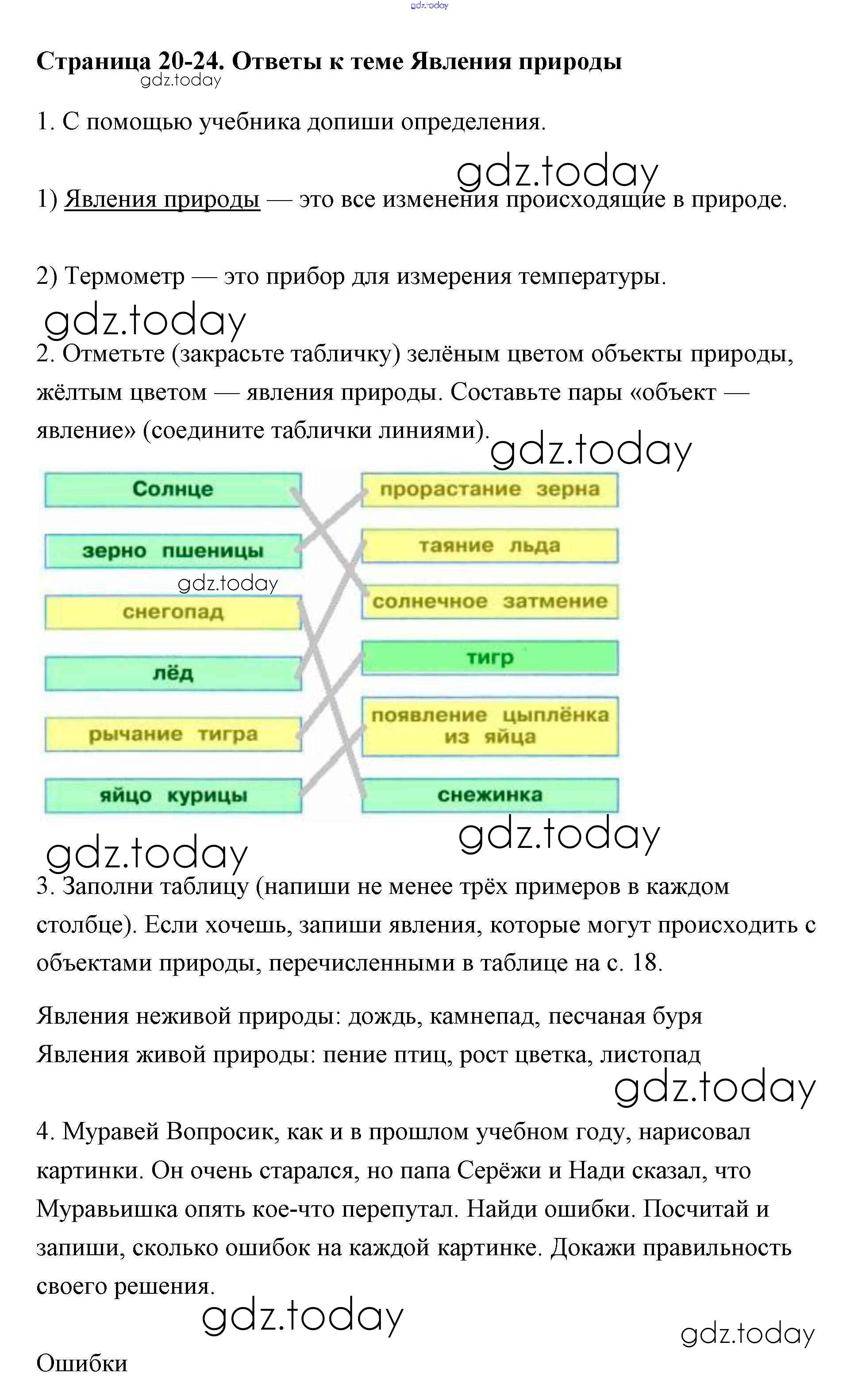 На страницах сайта gdz.today вы найдете учебный и вспомогательный материал, направленный на улучшения знаний школьной программы. ГДЗ - онлайн мир знаний Решение к части 1 (Страницы) 20-24 Рабочей тетради по Окружающему миру для 2 класса Плешаков Просвещение Школа России 2016