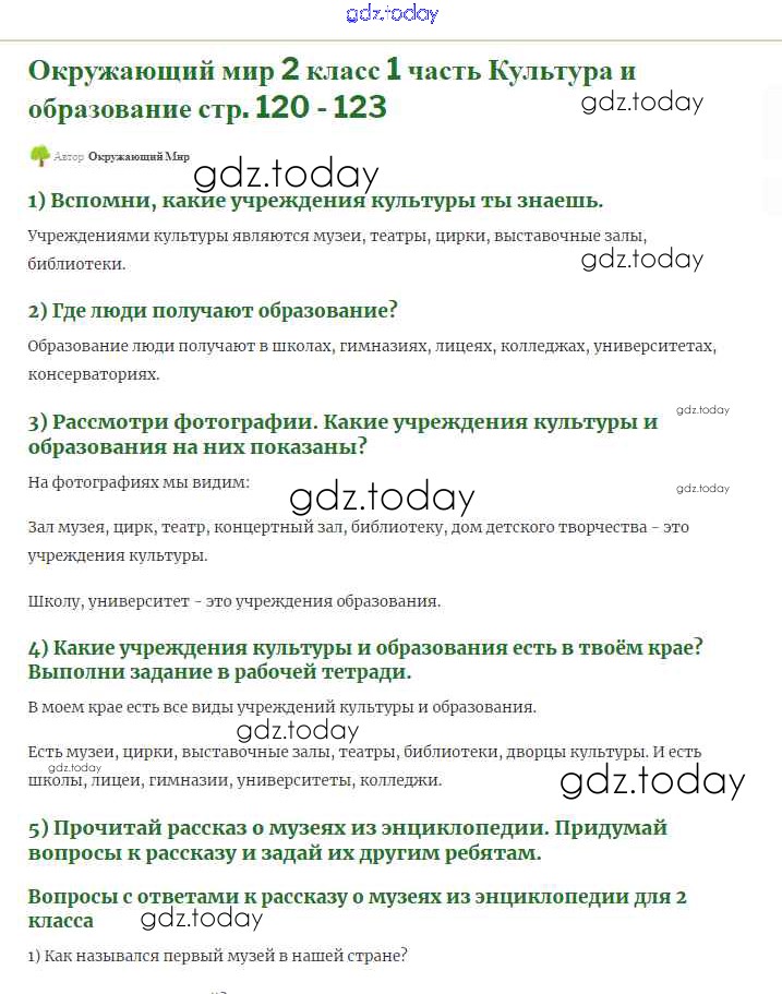 На страницах сайта gdz.today вы найдете учебный и вспомогательный материал, направленный на улучшения знаний школьной программы. ГДЗ - онлайн мир знаний Страницы Решение к части 1 120 Учебнику по Окружающему миру для 2 класса Плешаков Просвещение 2017