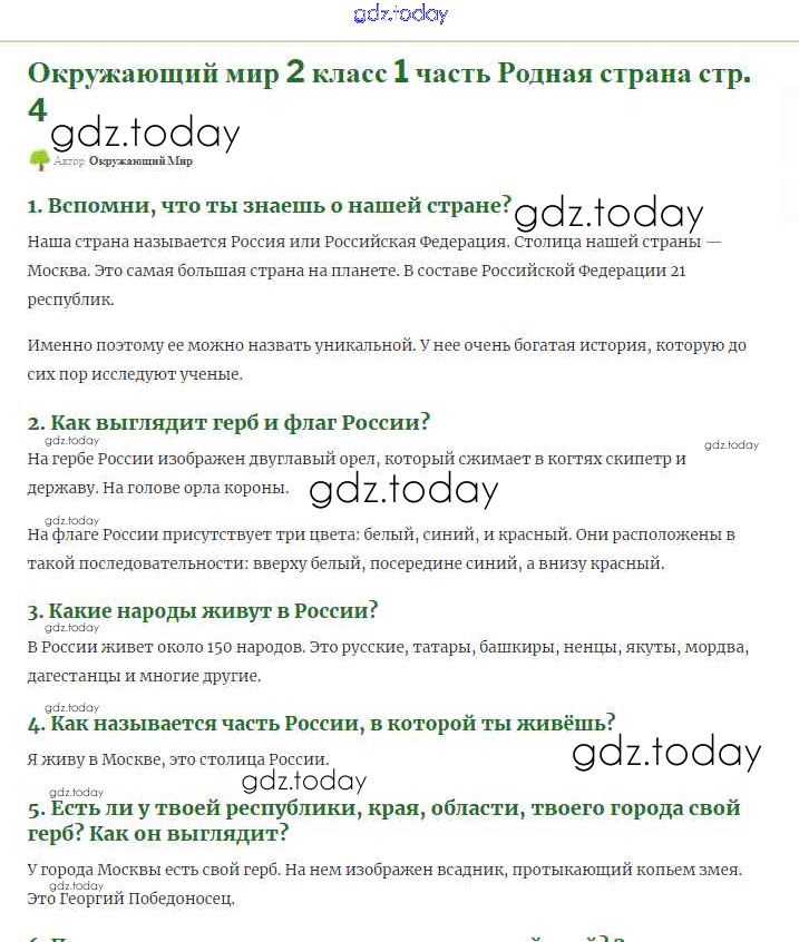 На страницах сайта gdz.today вы найдете учебный и вспомогательный материал, направленный на улучшения знаний школьной программы. ГДЗ - онлайн мир знаний Страницы Решение к части 1 4 Учебнику по Окружающему миру для 2 класса Плешаков Просвещение 2017