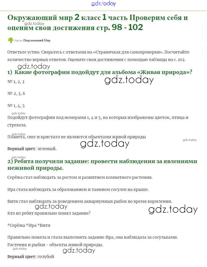 На страницах сайта gdz.today вы найдете учебный и вспомогательный материал, направленный на улучшения знаний школьной программы. ГДЗ - онлайн мир знаний Страницы Решение к части 1 98 Учебнику по Окружающему миру для 2 класса Плешаков Просвещение 2017