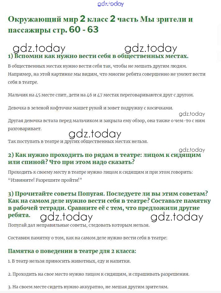 На страницах сайта gdz.today вы найдете учебный и вспомогательный материал, направленный на улучшения знаний школьной программы. ГДЗ - онлайн мир знаний Страницы Решение к части 2 60 Учебнику по Окружающему миру для 2 класса Плешаков Просвещение 2017