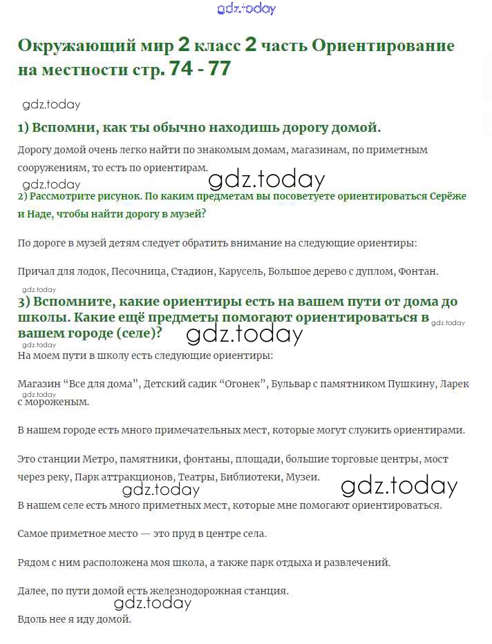 На страницах сайта gdz.today вы найдете учебный и вспомогательный материал, направленный на улучшения знаний школьной программы. ГДЗ - онлайн мир знаний Страницы Решение к части 2 74 Учебнику по Окружающему миру для 2 класса Плешаков Просвещение 2017