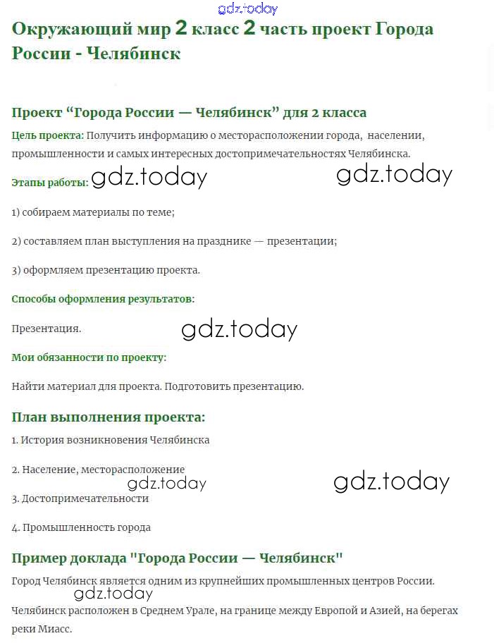 На страницах сайта gdz.today вы найдете учебный и вспомогательный материал, направленный на улучшения знаний школьной программы. ГДЗ - онлайн мир знаний Города России (страница 96) Решение к части 2 14 Учебнику по Окружающему миру для 2 класса Плешаков Просвещение 2017