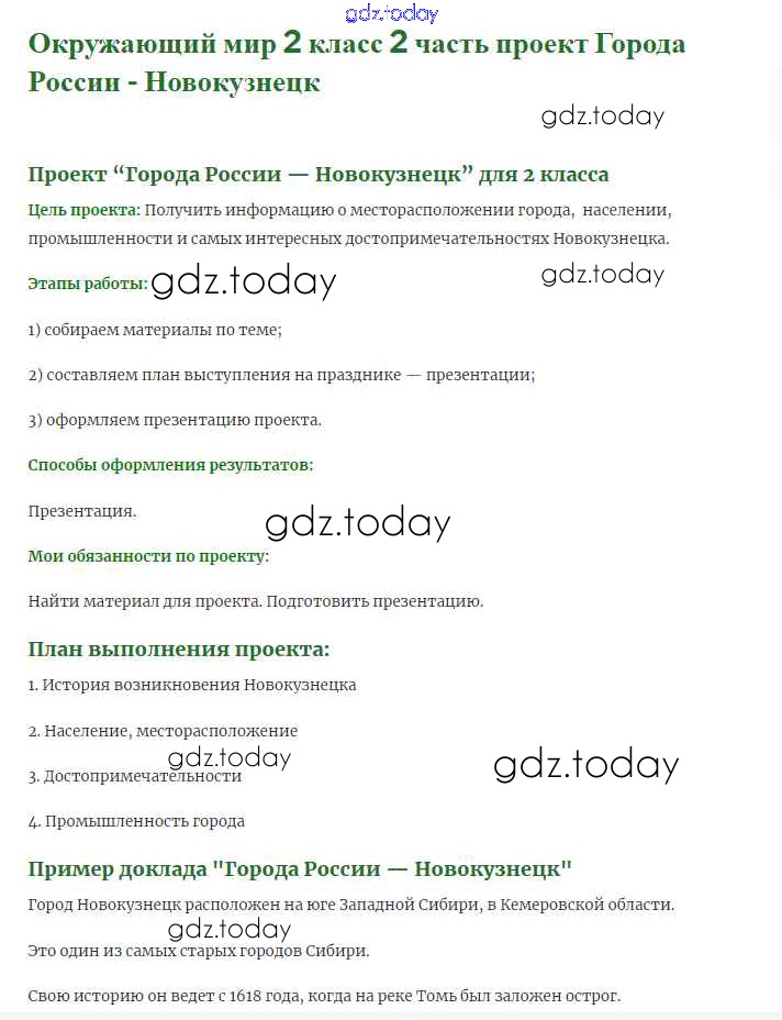На страницах сайта gdz.today вы найдете учебный и вспомогательный материал, направленный на улучшения знаний школьной программы. ГДЗ - онлайн мир знаний Города России (страница 96) Решение к части 2 9 Учебнику по Окружающему миру для 2 класса Плешаков Просвещение 2017