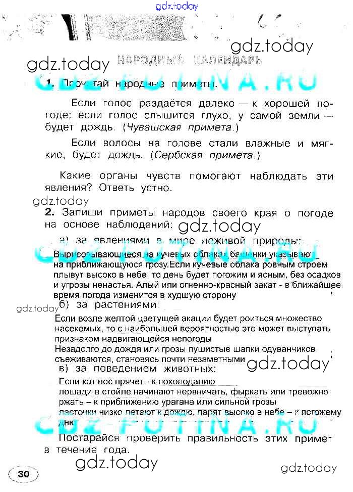 На страницах сайта gdz.today вы найдете учебный и вспомогательный материал, направленный на улучшения знаний школьной программы. ГДЗ - онлайн мир знаний Решение к части 1 (Страницы) 30 Рабочей тетради по Окружающему миру для 2 класса Плешаков, Новицкая Просвещение Перспектива 2017