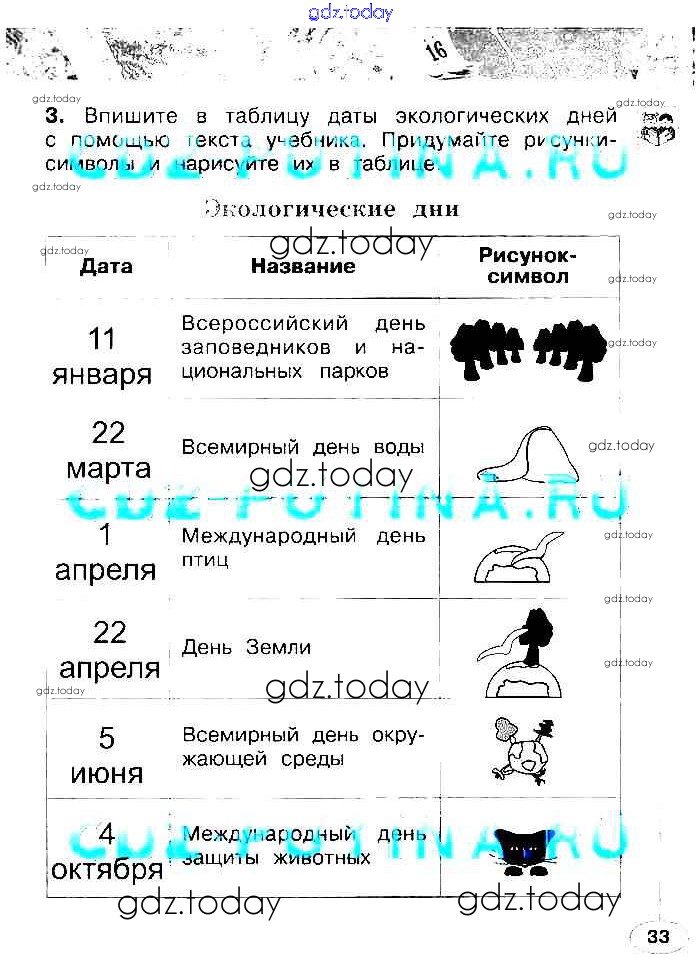 На страницах сайта gdz.today вы найдете учебный и вспомогательный материал, направленный на улучшения знаний школьной программы. ГДЗ - онлайн мир знаний Решение к части 1 (Страницы) 33 Рабочей тетради по Окружающему миру для 2 класса Плешаков, Новицкая Просвещение Перспектива 2017