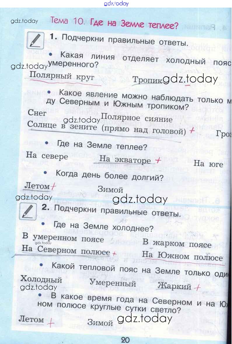 На страницах сайта gdz.today вы найдете учебный и вспомогательный материал, направленный на улучшения знаний школьной программы. ГДЗ - онлайн мир знаний Решение к теме 10. Где на Земле теплее стр. 20 Рабочей тетради по Окружающему миру для 2 класса Вахрушев, Бурский Баласс Школа 2100 2016