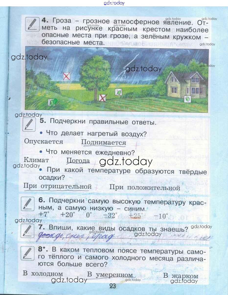 На страницах сайта gdz.today вы найдете учебный и вспомогательный материал, направленный на улучшения знаний школьной программы. ГДЗ - онлайн мир знаний Решение к теме 11. Погода и климат стр. 23 Рабочей тетради по Окружающему миру для 2 класса Вахрушев, Бурский Баласс Школа 2100 2016