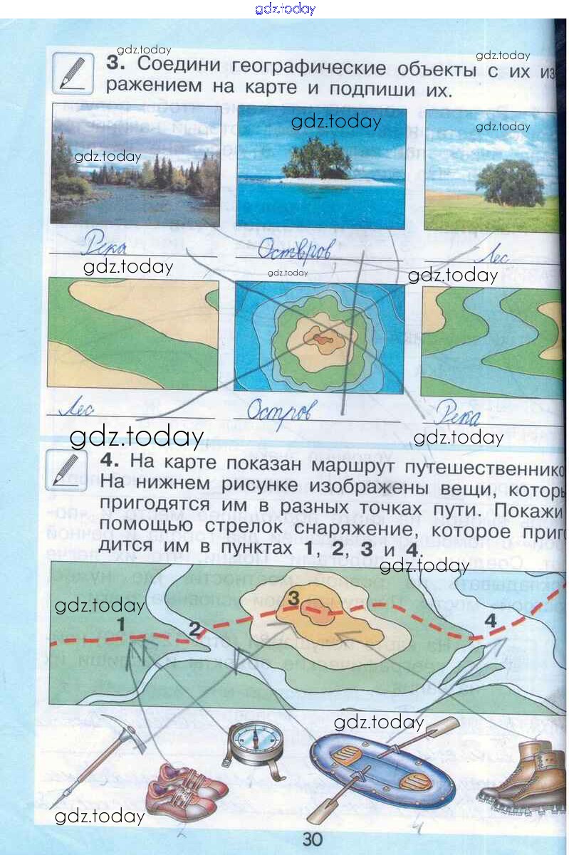 Ответы к Решение к теме 14. Что изображают на карте стр. 30 Рабочей тетради по Окружающему миру для 2 класса Вахрушев, Бурский Баласс Школа 2100 2016
