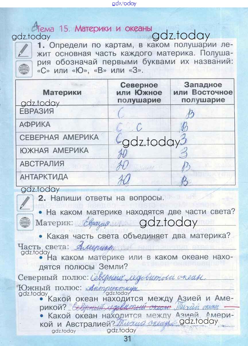 Ответы к Решение к теме 15. Материки и океаны стр. 31 Рабочей тетради по Окружающему миру для 2 класса Вахрушев, Бурский Баласс Школа 2100 2016