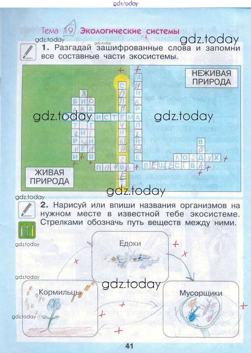 На страницах сайта gdz.today вы найдете учебный и вспомогательный материал, направленный на улучшения знаний школьной программы. ГДЗ - онлайн мир знаний Решение к теме 19. Экологические системы стр. 41 Рабочей тетради по Окружающему миру для 2 класса Вахрушев, Бурский Баласс Школа 2100 2016