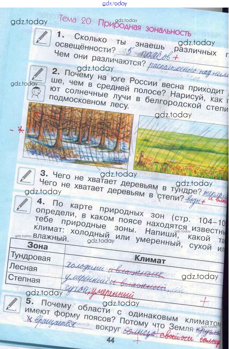 На страницах сайта gdz.today вы найдете учебный и вспомогательный материал, направленный на улучшения знаний школьной программы. ГДЗ - онлайн мир знаний Решение к теме 20. Природная зональность стр. 44 Рабочей тетради по Окружающему миру для 2 класса Вахрушев, Бурский Баласс Школа 2100 2016