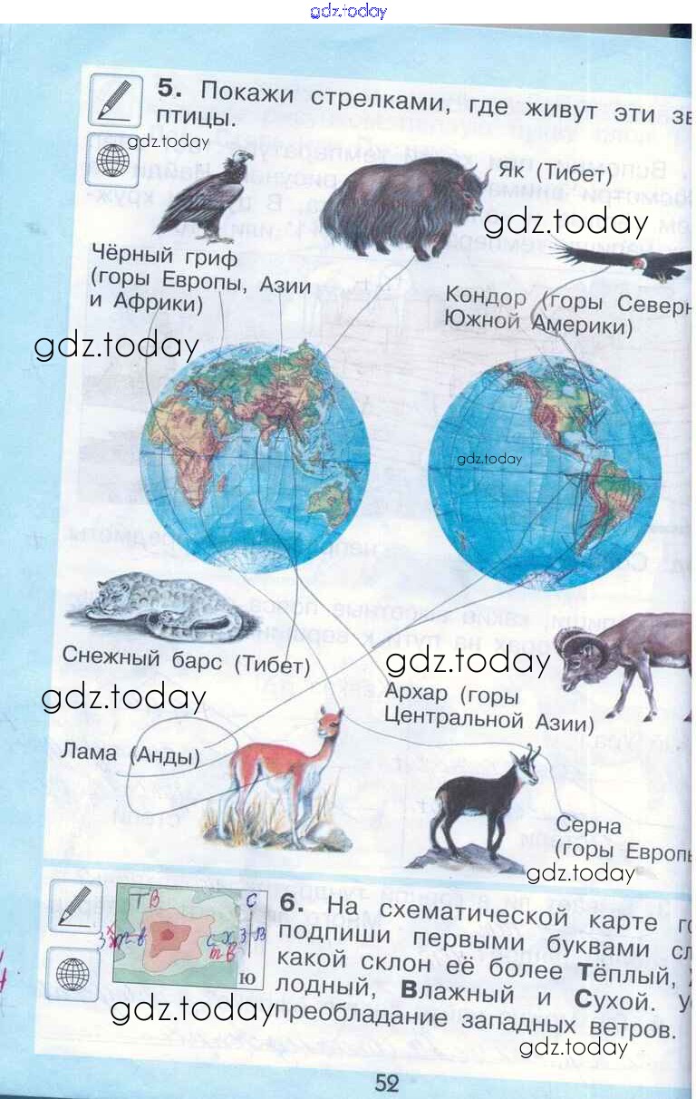 На страницах сайта gdz.today вы найдете учебный и вспомогательный материал, направленный на улучшения знаний школьной программы. ГДЗ - онлайн мир знаний Решение к теме 25. Горные экосистемы стр. 52 Рабочей тетради по Окружающему миру для 2 класса Вахрушев, Бурский Баласс Школа 2100 2016