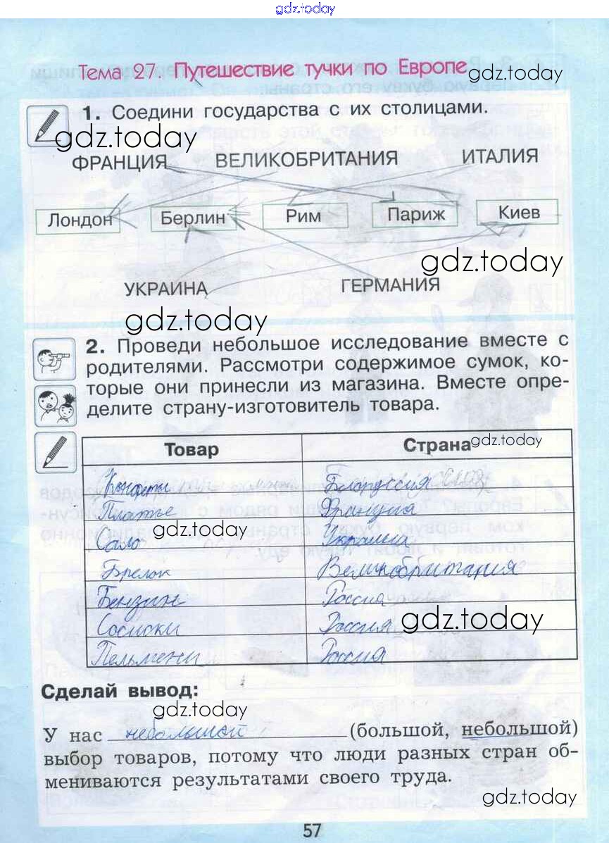 На страницах сайта gdz.today вы найдете учебный и вспомогательный материал, направленный на улучшения знаний школьной программы. ГДЗ - онлайн мир знаний Решение к теме 27. Путешествие тучки по Европе стр. 57 Рабочей тетради по Окружающему миру для 2 класса Вахрушев, Бурский Баласс Школа 2100 2016