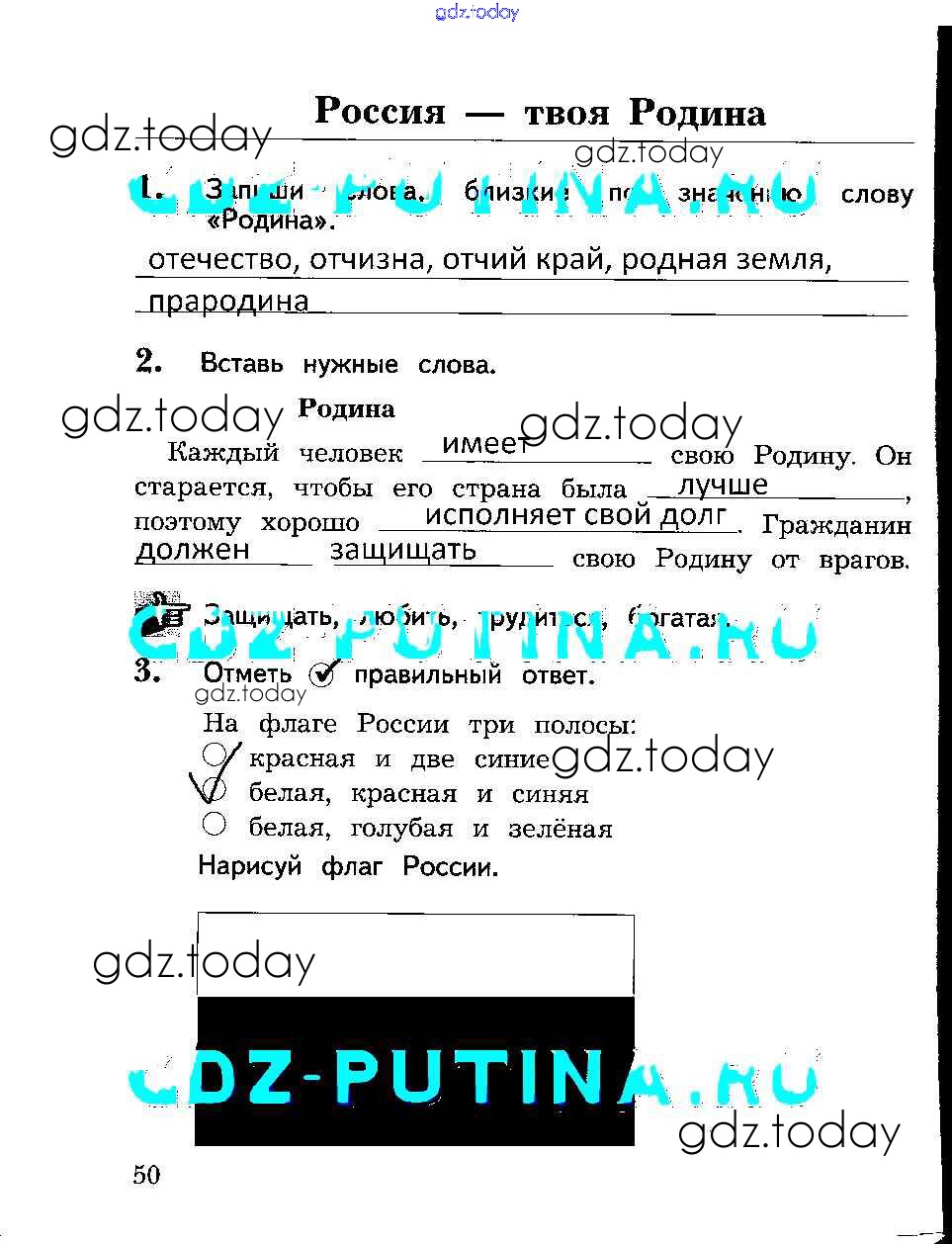На страницах сайта gdz.today вы найдете учебный и вспомогательный материал, направленный на улучшения знаний школьной программы. ГДЗ - онлайн мир знаний Решение к части 1. Страницы 50 Рабочей тетради по Окружающему миру для 2 класса Виноградова Вентана-граф Алгоритм успеха 2017