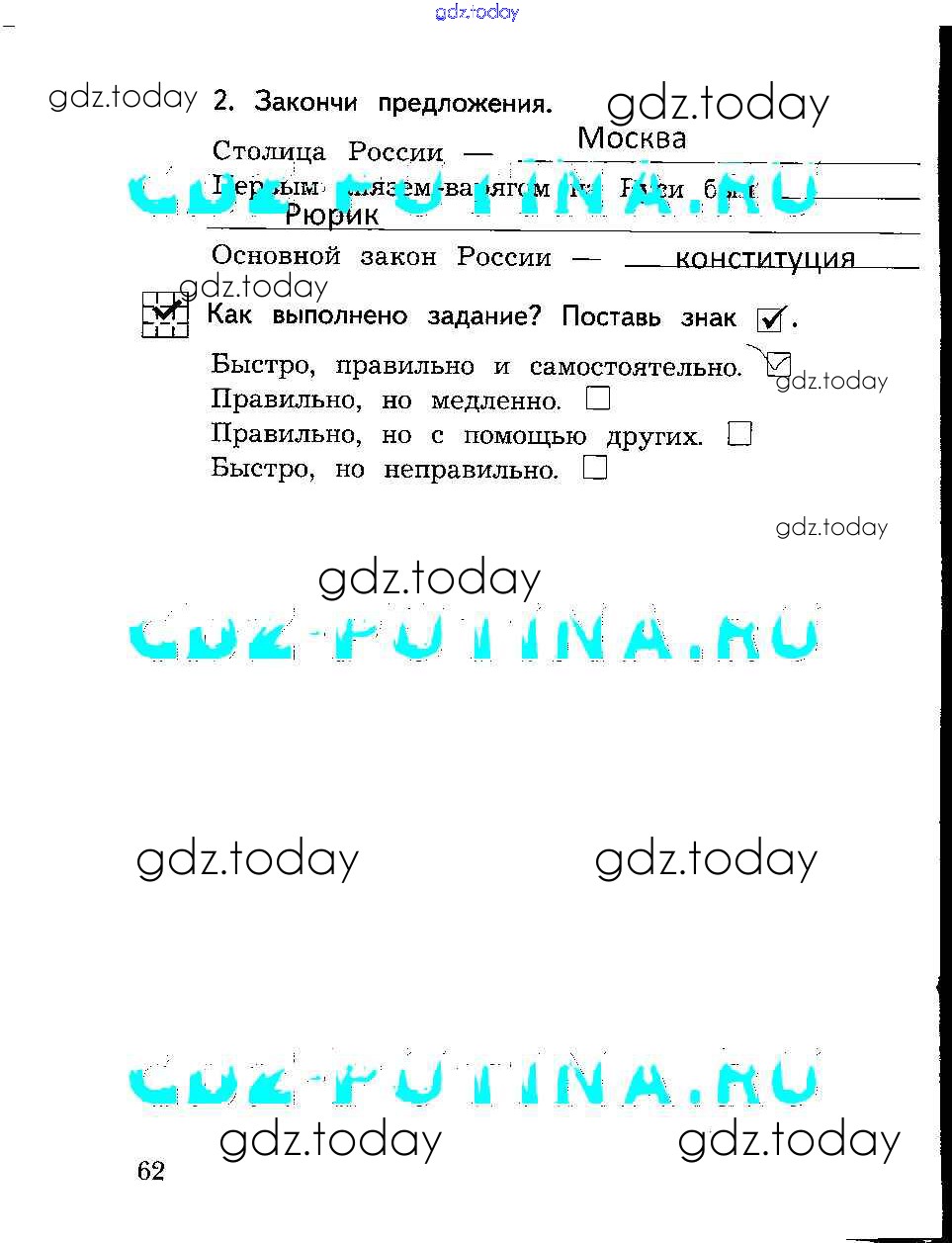 На страницах сайта gdz.today вы найдете учебный и вспомогательный материал, направленный на улучшения знаний школьной программы. ГДЗ - онлайн мир знаний Решение к части 1. Страницы 62 Рабочей тетради по Окружающему миру для 2 класса Виноградова Вентана-граф Алгоритм успеха 2017