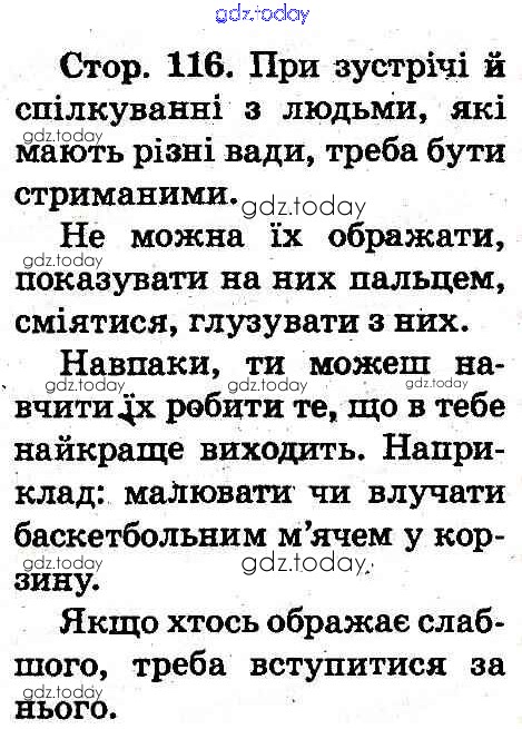 На страницах сайта gdz.today вы найдете учебный и вспомогательный материал, направленный на улучшения знаний школьной программы. ГДЗ - онлайн мир знаний Рішення до Сторінки 116 Учебнику по Основам здоровья для 2 класса Воронцова, Бех Алатон 2012