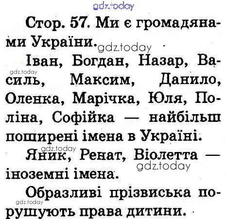 На страницах сайта gdz.today вы найдете учебный и вспомогательный материал, направленный на улучшения знаний школьной программы. ГДЗ - онлайн мир знаний Рішення до Сторінки 57 Учебнику по Основам здоровья для 2 класса Воронцова, Бех Алатон 2012
