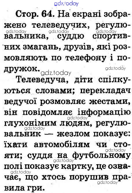 На страницах сайта gdz.today вы найдете учебный и вспомогательный материал, направленный на улучшения знаний школьной программы. ГДЗ - онлайн мир знаний Рішення до Сторінки 64 Учебнику по Основам здоровья для 2 класса Воронцова, Бех Алатон 2012